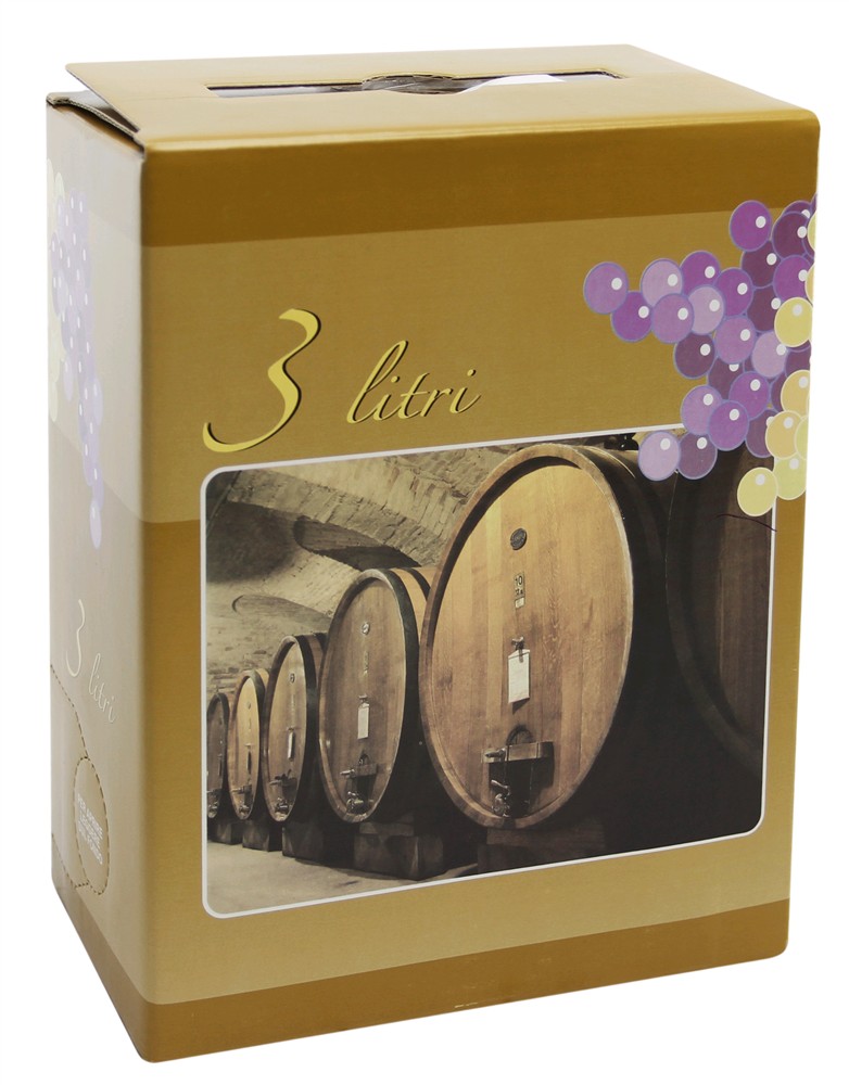 Kuti ambalazhimi kartoni 3 litra për qesen e aluminit të verës. Përdoret me qesen e aluminit, të cilat, pasi mbushen me verë, vendosen brenda kutisë së kartonit për mbrojtjen ndaj goditjeve.