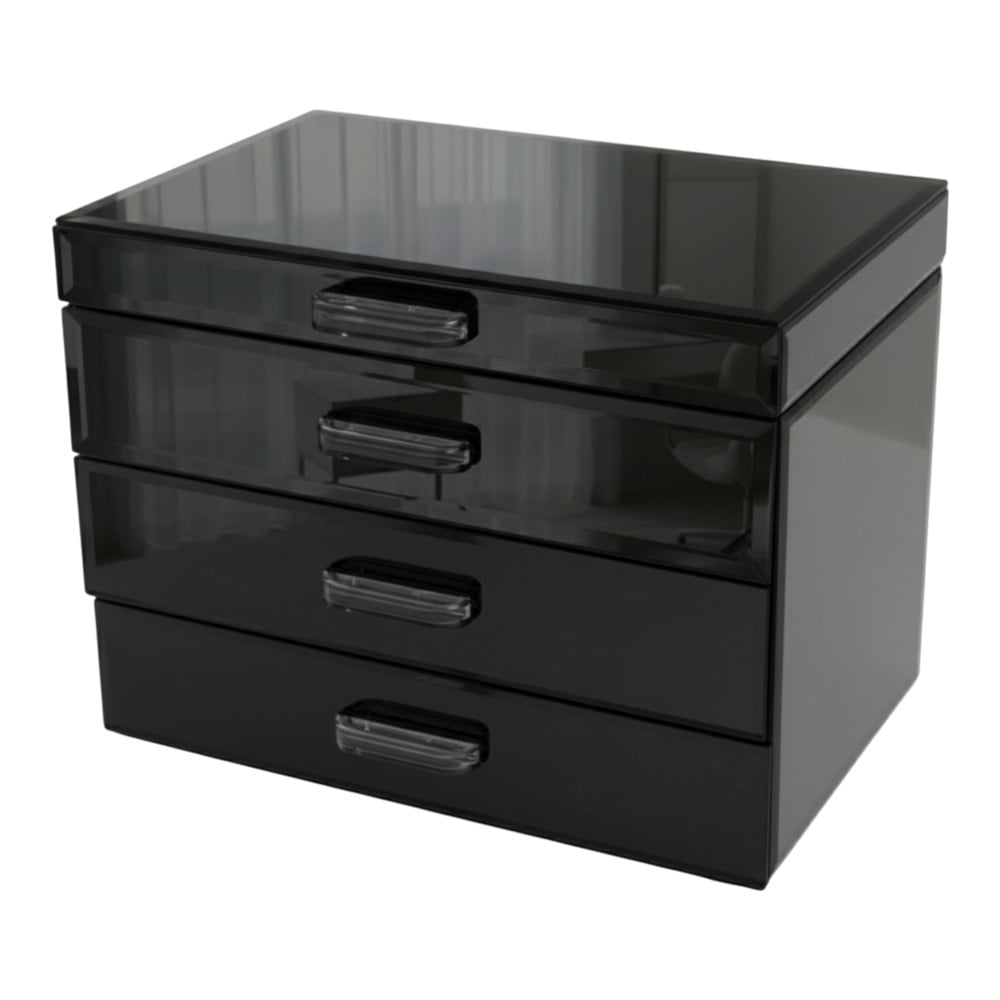 Organizoni bizhuteritë tuaja me stil dhe elegancë me këtë kuti magazinimi prej rezine dhe xhami me efekt pasqyre. E dizajnuar në ngjyrë të zezë, kjo kuti është më shumë se një zgjidhje praktike, është gjithashtu dhe një aksesor dekorativ që shton hijeshi në çdo komodinë, tavolinë apo raft. Me përmasa 24x16x18 cm, ofron hapësirë të bollshme për unaza, varëse, vathë apo aksesorë të tjerë, duke i mbajtur ata të organizuar dhe lehtësisht të aksesueshëm. Struktura e kombinuar e rezinës së qëndrueshme dhe xhami reflektues krijon një efekt modern e luksoz, që pasqyron dritën dhe shton ndriçim në hapësirë.