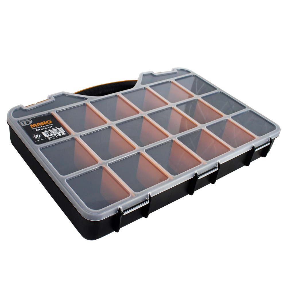 Kuti e veglave organizuese prej plastike transparente me 18 ndarje, me përmasë 420x305x61 mm është e dizenjuar për t'u përdorur nga profesionistët. Kjo kuti ka një konstrukt të fortë dhe rezistent. Me mundësi organizimi të aksesorëve të veglave dhe ndarje sipas madhësive të tyre. Duke bërë të mundur sistemimin e veglave në një hapësirë shumë të vogël.