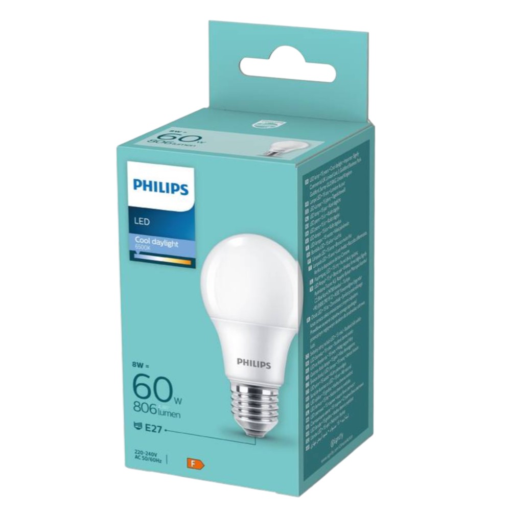 Llambë LED Philips, 8W (zëvendëson 60W tradicionale), me bazë E27, ofron 806 lumen dhe dritë të bardhë të ftohtë 6400K. Zgjidhje efikase dhe jetëgjatë për ndriçim të pastër dhe energjik në ambiente si zyra, korridore apo hapësira pune.