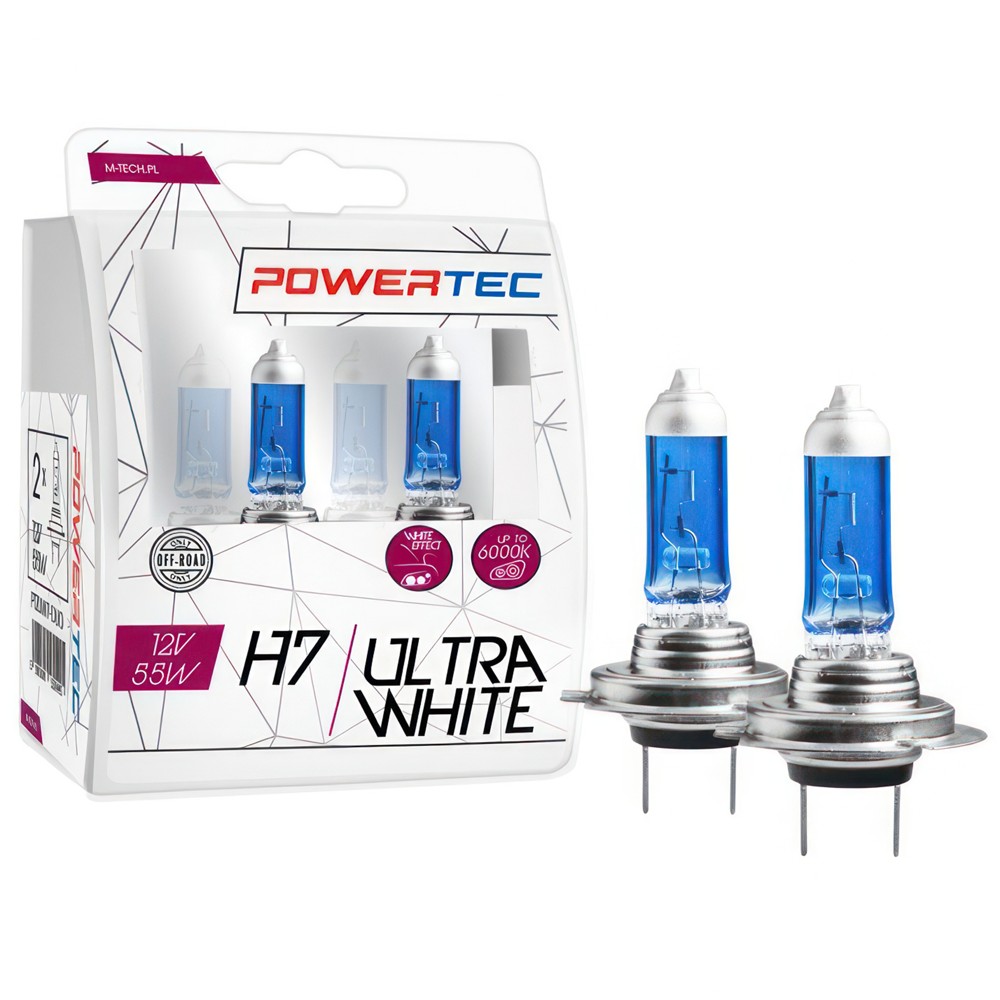 Llampa halogjene PowerTec Ultra White H7 siguron deri në 100% më shumë dritë në rrugë në krahasim me llampat e tjera standarde. Një shtresë e veçantë blu e lehtë nuk e zvogëlon cilësinë ose intensitetin e dritës. Në këtë mënyrë kemi arritur një dritë të bardhë perfekte, e cila është më pak e lodhshme për sytë e shoferit dhe siguron shikueshmëri më të mirë. Një rreze e zgjatur e dritës ju lejon të vini re më herët pengesat e mundshme, gjë që rrit ndjeshëm sigurinë në rrugë.