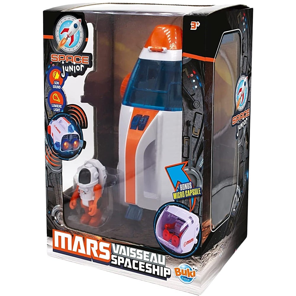 Seti i lojërave Buki është një zgjedhje e shkëlqyer për të gjithë adhuruesit e vegjël të fluturimit në hapësirë. Është i përshtatshëm për fëmijët e moshës 3+ dhe stimulon imagjinatën dhe aftësitë e shkëlqyera motorike. Kompleti përfshin një kapsulë, një astronaut dhe një anije kozmike që ka zë dhe dritë.
