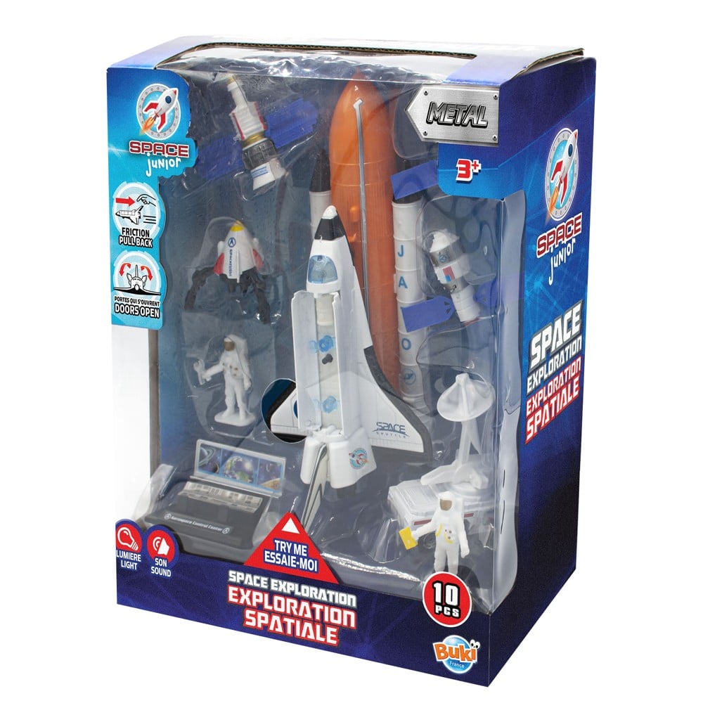 Seti i lojërave është një zgjedhje e shkëlqyer për të gjithë adhuruesit e vegjël të fluturimit në hapësirë. Është i përshtatshëm për fëmijët e moshës 3+ dhe stimulon imagjinatën dhe aftësitë e shkëlqyera motorike. Kompleti përfshin një anije kozmike, një shtytës (tank dhe 2 disqe), një kamion satelitor, një qendër kontrolli, 2 astronautë, 3 satelitë dhe një tokëzues. Lodra bën tingull dhe ndizet ndërsa anijes niset.