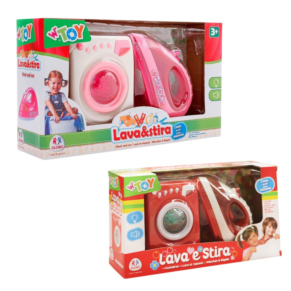 Lodër për fëmijë Globo, lavatriçe dhe hekur me bateri, është ideale për fëmijët mbi 36 muajsh. Ky set i ndihmon fëmijët të zhvillojnë aftësitë motorike dhe imagjinatën duke imituar punët e përditshme.