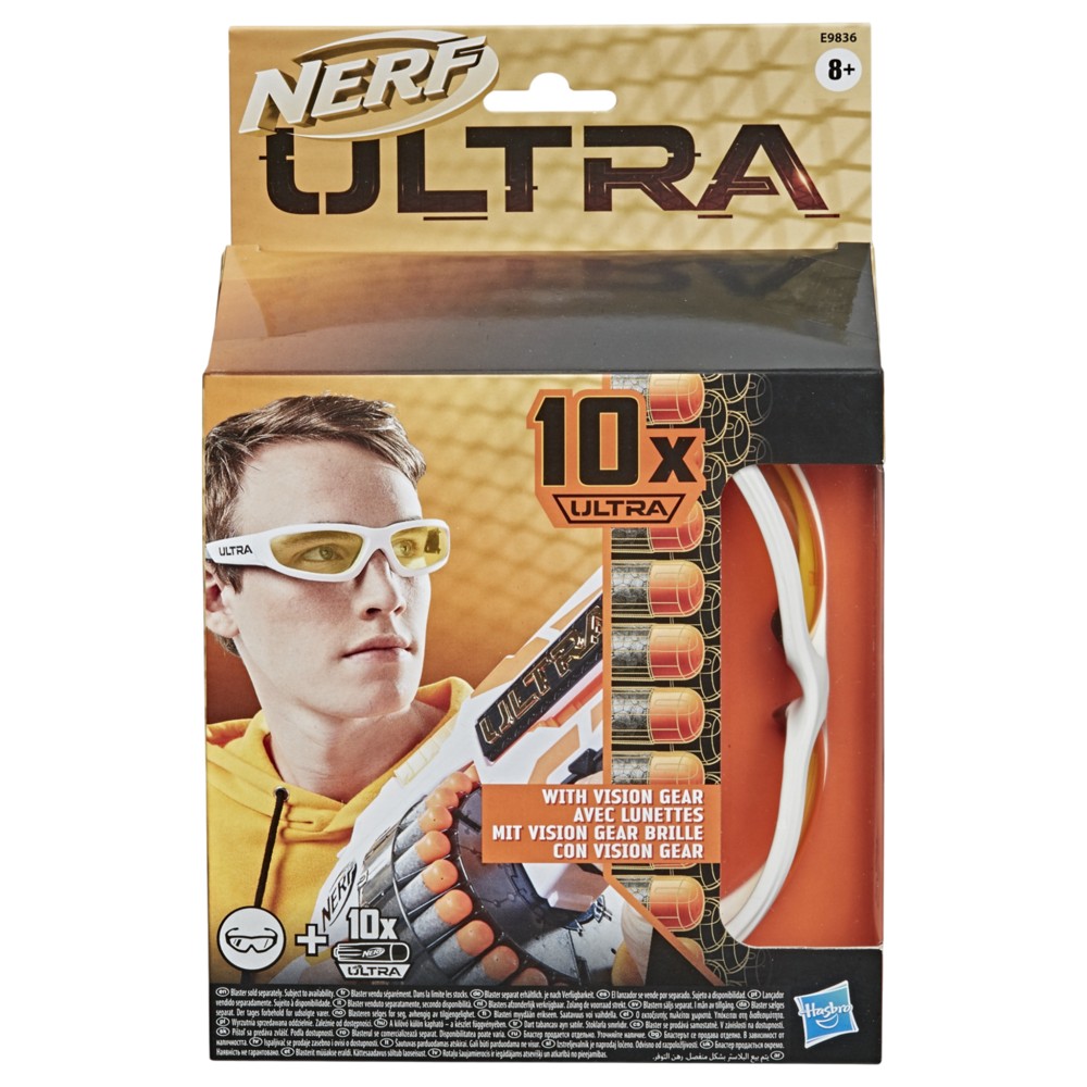 Ky set për lojë dhe siguri krijon eksperiencë përfshirëse për çdo adhurues NERF. Syzet mbrojtëse Vision Gear ju mbrojnë nga pluhuri i fishekëve, ndërsa 10 fishekët Ultra ofrojnë performancë optimale dhe saktësi me çdo pistolete. Seti është i përshtatshëm për lojtarë të vegjël +8 vjeç .