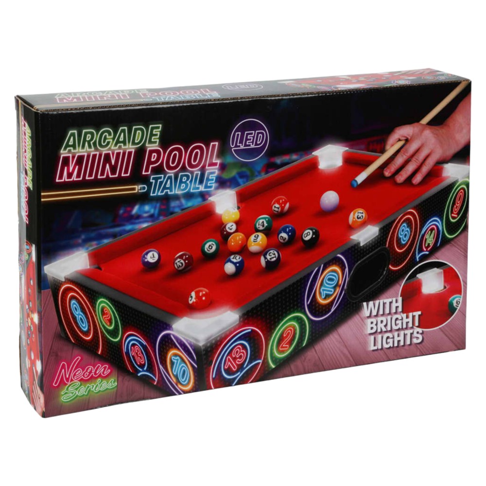 Kjo mini tavolinë bilardo me drita LED nga Tender Toys do të përshtatet në mënyrë të përkryer me çdo ambient. Falë dritave LED të inkorporuara në trup, kjo e fundit do të jetë më tërheqëse dhe do t'ju ndihmojë të shikoni më mirë në ambiente me dritë të ulët.Materiali është MDF dhe PVC, me përmasat e tavolinës që janë 48.5 x 30 x 8.5 cm. Kërkon bateri 3 x AA (bateritë përjashtohen). I përshtatshëm për 2 lojtarë.