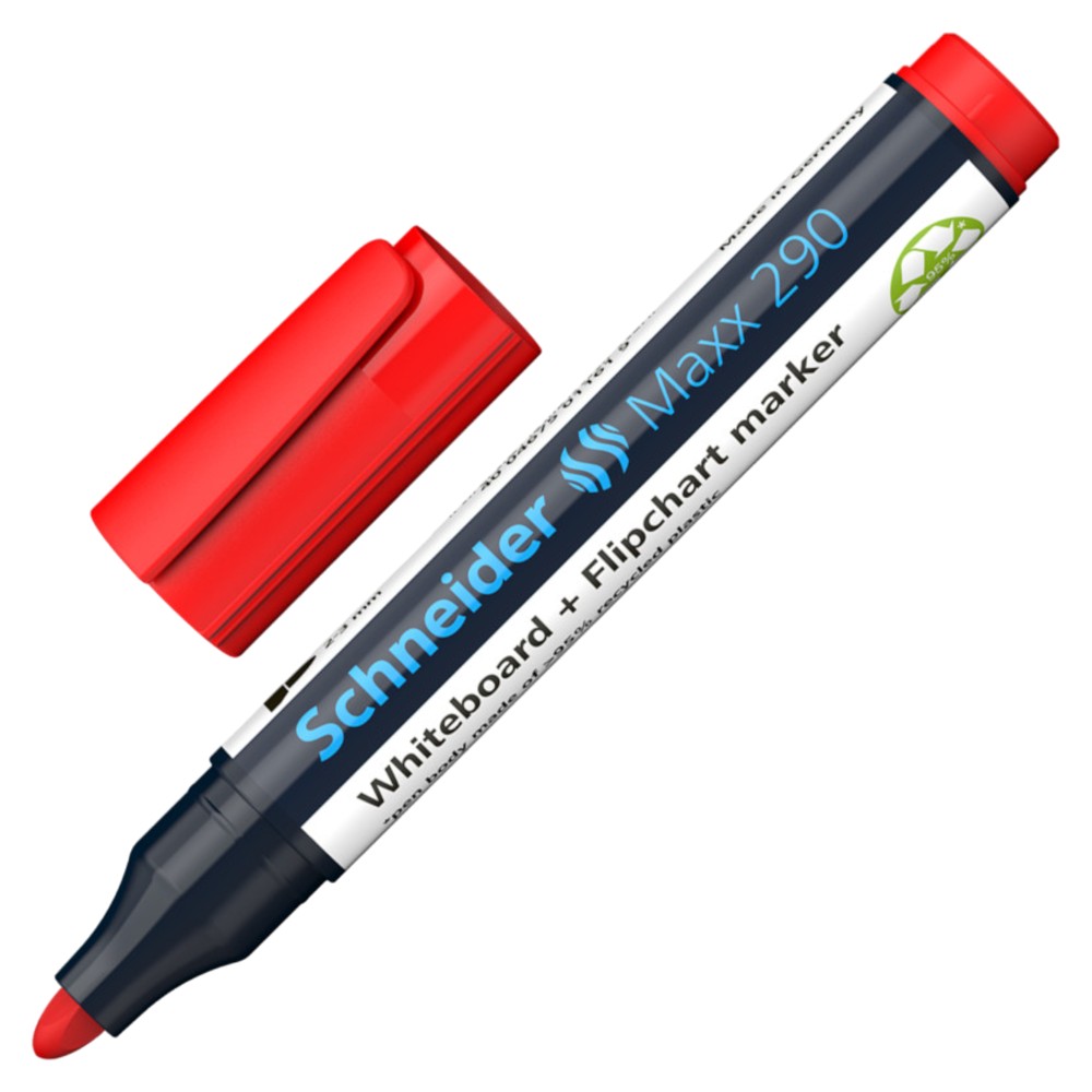 Marker për tabelë të bardhë, gjerësia e vijës 2-3 mm. Ngjyra e shkrimit e kuqe. Qoftë në një tabelë të bardhë apo në letër, ngjyrat e forta dhe të gjalla janë të lehta për t'u lexuar edhe nga pjesa e pasme e dhomës. Boja mund të hiqet nga tabelat e bardha me një leckë të thatë pa lënë mbetje dhe nuk do të depërtojë në faqen prapa. Boja me kapak nuk thahet edhe nëse kapaku hiqet për 2-3 ditë. Ka një aromë të ulët dhe nuk përmban toluol dhe xylol.