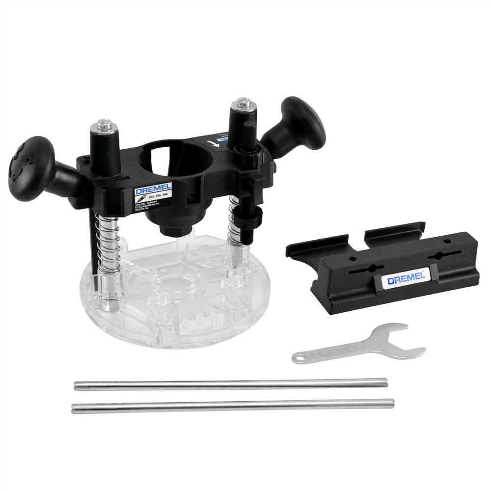 Mbajtëse freze për mini zmerilues. Me anë të këtij aksesori ju mund të ktheni mini zmeriluesin tuaj në një frezë dhe mund ta përdorni për të shpuar, për të bërë dekorime të ndryshme etj. E pajisur me dy doreza për një kontroll maksimal. Për më shumë saktësi ka dy rregjistrues thellësie.