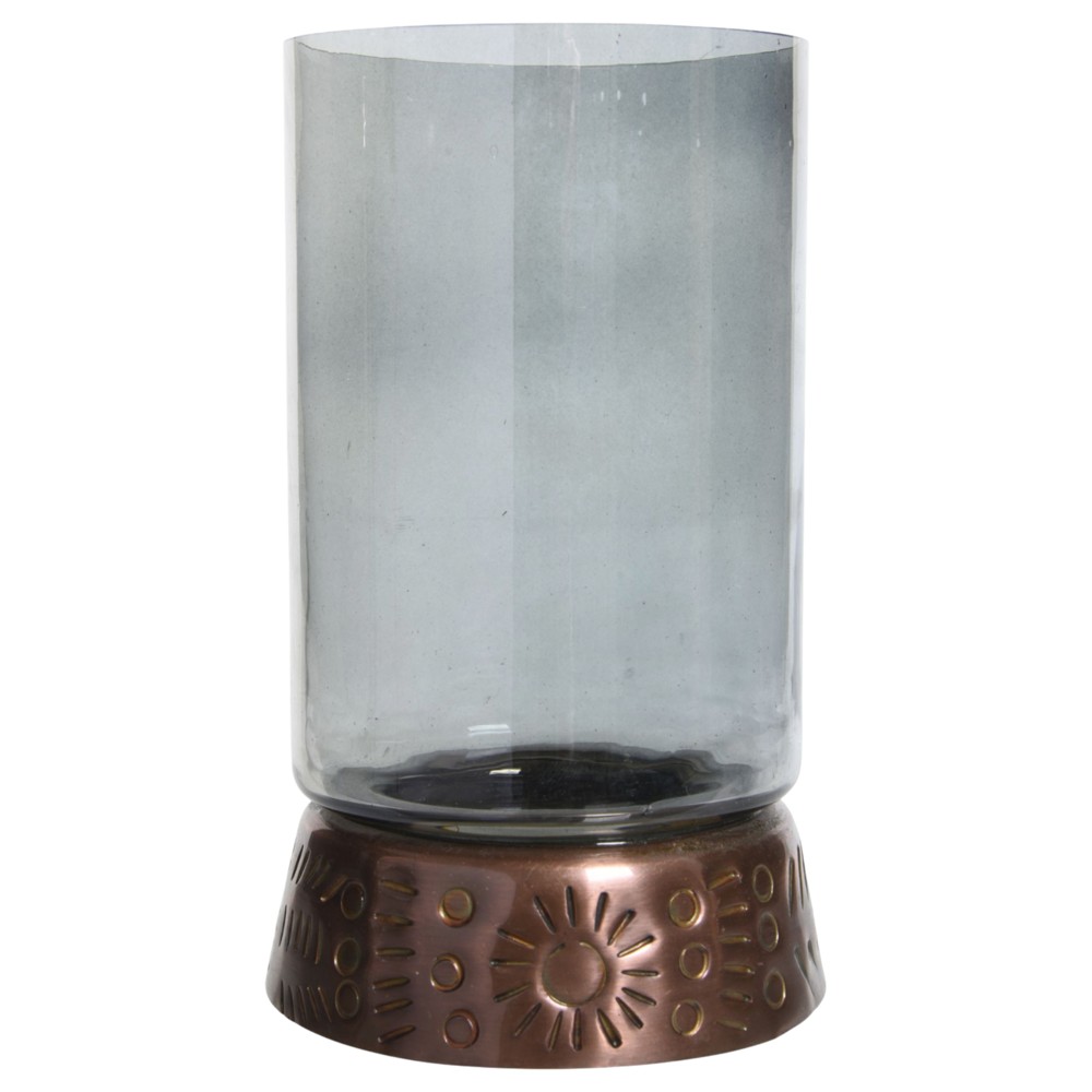 Kjo mbajtëse qiriu është një aksesor elegant dhe funksional, i punuar me kombinim të materialeve metalike dhe qelqi transparent. Me përmasa Dia.9.5xH18.5 cm, ajo ka një dizajn të veçantë ku baza metalike me motive dekorative i jep një prekje rustike dhe artistike. Pjesa e sipërme prej qelqi transparent lejon shpërndarjen natyrale të dritës së qiriut, duke krijuar një atmosferë të ngrohtë dhe mikpritëse në çdo ambient. Është ideale për përdorim në dhoma ndenjeje, tavolina darke apo ambiente të tjera të brendshme ku kërkohet ndriçim dekorativ dhe stil.