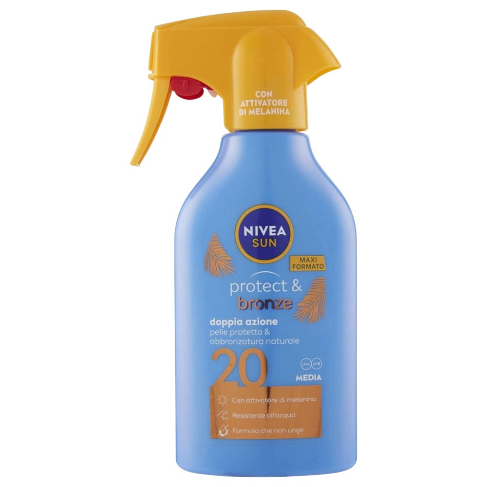 Nivea Protect & Bronze SPF 20 është një krem mbrojtës nga dielli që ofron mbrojtje të mirë kundër rrezeve UVA dhe UVB, ndërkohë që ndihmon në nxitjen e nxirjes natyrale të lëkurës. Formula përmban përbërës të veçantë që stimulojnë prodhimin e melaninës pa përdorur autobronzues, duke ndihmuar që lëkura të marrë një ngjyrë të artë dhe uniforme. Ky mbrojtës ka gjithashtu një efekt hidratues, duke parandaluar tharjen e lëkurës dhe duke ruajtur butësinë dhe elasticitetin e saj gjatë gjithë ditës. Produkti është rezistent ndaj ujit dhe i përshtatshëm për përdorim të përditshëm. Vendosni një sasi të bollshme të kremit në lëkurë të pastër, rreth 15-20 minuta para daljes në diell. Përsëriteni çdo 2 orë, dhe gjithashtu pas notit, djersitjes ose fshirjes me peshqir, për mbrojtje të qëndrueshme.