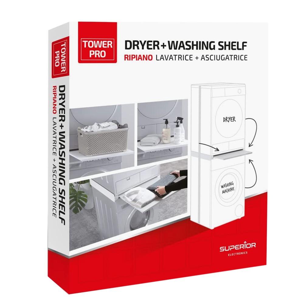 Ndarëse lavatriçe/tharëse Tower Pro, me raft të lëvizshëm. Kursen hapësirë duke ju lejuar të vendosni tharësen tuaj sipër makinës larëse. E thjeshtë në përdorim. Gjerësia: 60 cm. Kapaciteti maksimal i peshës së raftit: 8 kg / 17.6 lbs. E përputhshme me të gjitha lavatriçet dhe tharëset me ngarkesë të përparme, 60 cm gjerësi standarde ose të holla, me një thellësi maksimale 60 cm. Shpejtë dhe lehtë për t'u instaluar. Rrip sigurie 6 metra i përfshirë. Ngarkesa maksimale vertikale e suportit: 60 kg / 132lb.