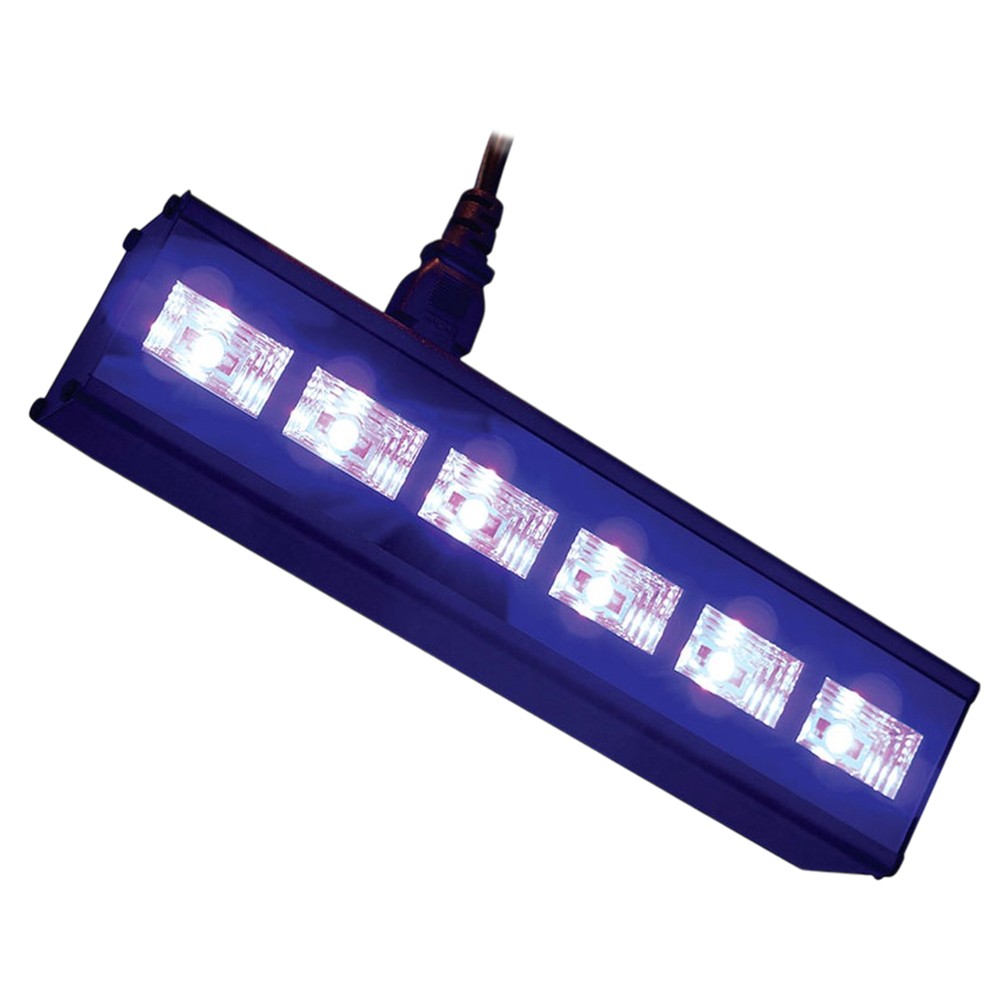 Drita e zezë LED UV (6x3 W). Me këtë dritë të zezë ju e bëni dekorimin edhe më të shndritshëm. Sipërfaqet e bardha reagojnë ndaj dritës UV dhe bëhen blu. Ka edhe disa pëlhura dhe materiale që reagojnë ndaj dritës së zezë. Produkti nuk është i papërshkueshëm nga uji, kështu që mund të përdoret vetëm brenda.