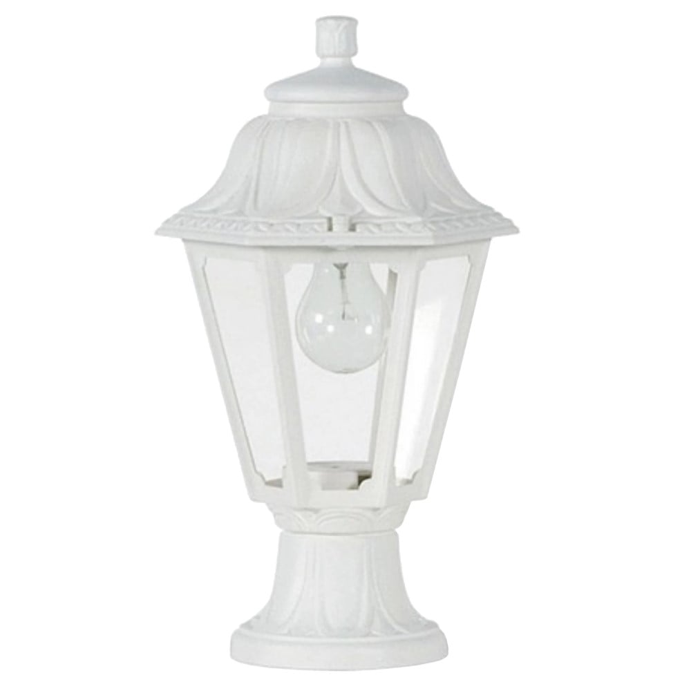 Ndricues I jashtem tokesor, Fumagalli, i bardhe, xham transparent, 1 x E27, D13 x H38.5 cm. Shtojini bukuri, hijeshi dhe funksionalitet ambjenteve tuaja të jashtme. Për të kaluar mbrëmje sa më të këndshme me miqtë dhe familjen në verandat apo kopshtet tuaja ndriçimi është një element i pazëvendësueshëm ndaj, një zgjedhje e shkëlqyer do të ishte ky ndriçues prej alumini me një dizajn fin dhe elegant.