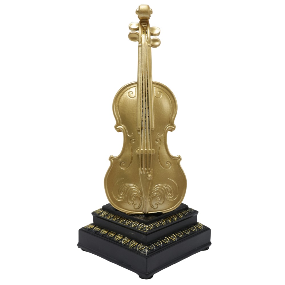 Një aksesor i rafinuar që sjell artin dhe muzikën në zemër të dekorit tuaj. Ky objekt dekorativ në formë violine dhe në një dizajn elegant, sjellë një atmosferë artistike dhe të ngrohtë në çdo ambient. E realizuar nga rezinë cilësore dhe e zbukuruar me ngjyrë floriri, kjo pjesë unike është ideale për dashamirësit e muzikës dhe objekteve me stil klasik. Me përmasa 16x16xH28.5 cm, është perfekte për vendosje në rafte, komodina apo në zyrë si një pikë vizuale që tërheq vëmendjen.
