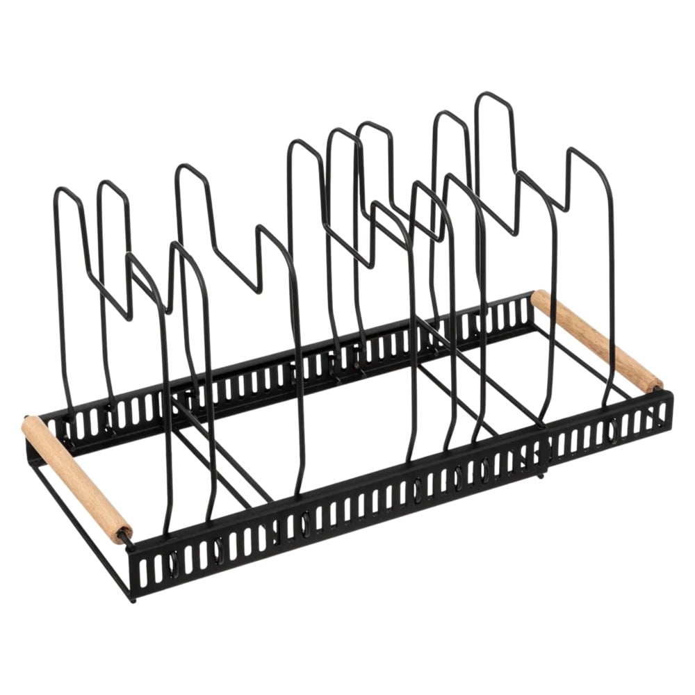 Organizues për zonën e kuzhinës prej materiali metalik në ngjyrë të zezë. Ka 8 mbajtëse të lëvizshme për të organizuar kapakë, tenxhere, tepsi, tabaka apo çdo gjë tjetër që dëshironi. Është ideal për t'u vendosur në një dollap ose raft, duke kursyer hapësirë.