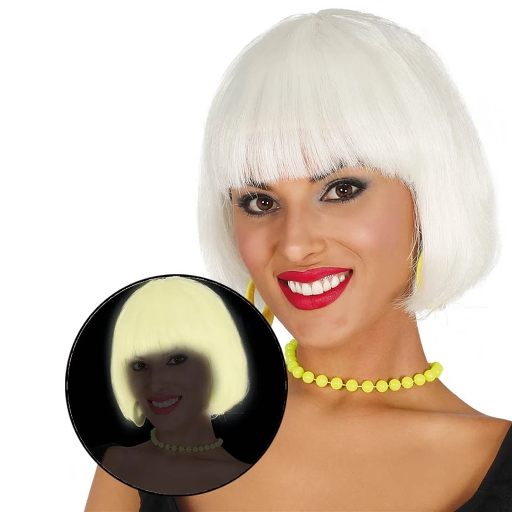 Paruke për flokët, prej materiali sintetik, në ngjyrë të bardhë. Parukja ka të vecantë ngjyrën floreshente. Ideale për tu përdorur në errësirë.