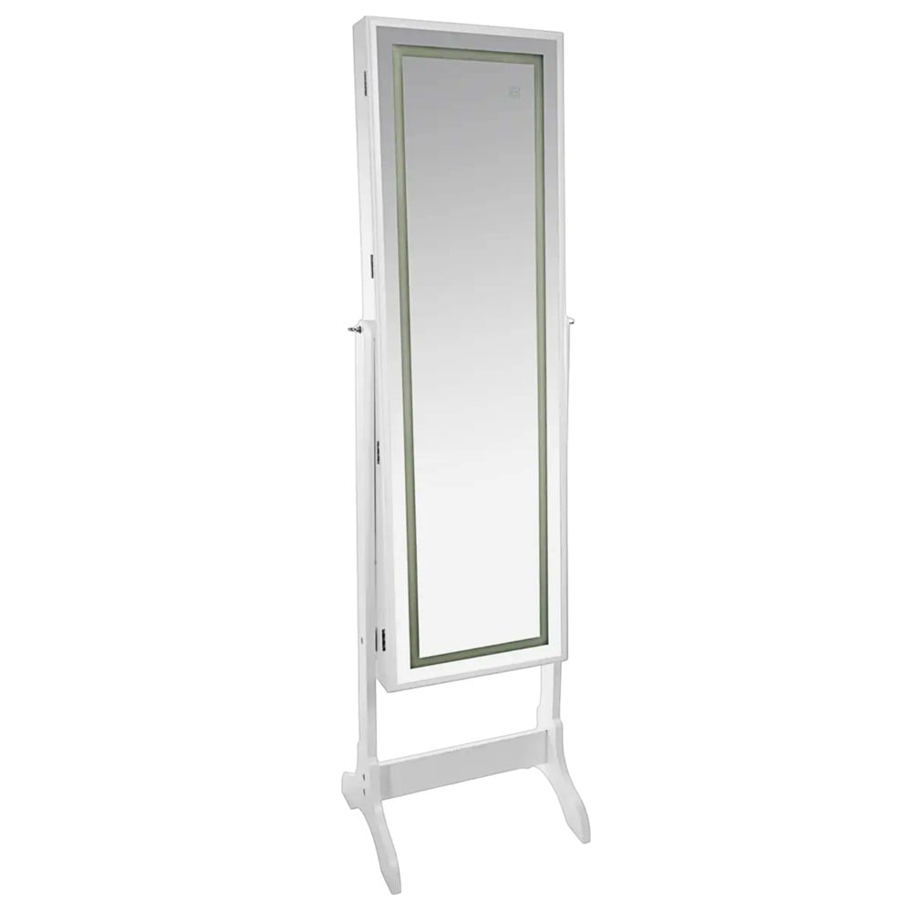 Pasqyrë e plotë statike me dollap bizhuterish të integruar, ideale për vendosje në dhomën e gjumit ose hyrjen e shtëpisë tuaj. Korniza është prej druri mdf në nuancë të bardhë. Rreth perimetrit të pasqyrës ka një dritë LED, e cila pulson me një buton me prekje dhe funksionon me 3 bateri AA LR6, të cilat nuk përfshihen. Mund ta rregulloni animin e tij në pikën që ju përshtatet. Brenda ka një kuti bizhuterish, të veshur me pëlhurë të zezë, që ofron hapësira për varëse, vathë, byzylykë etj. Në këtë mënyrë ju do t'i mbani bizhuteritë tuaja të organizuara mirë pa asnjë goditje apo gërvishtje.
