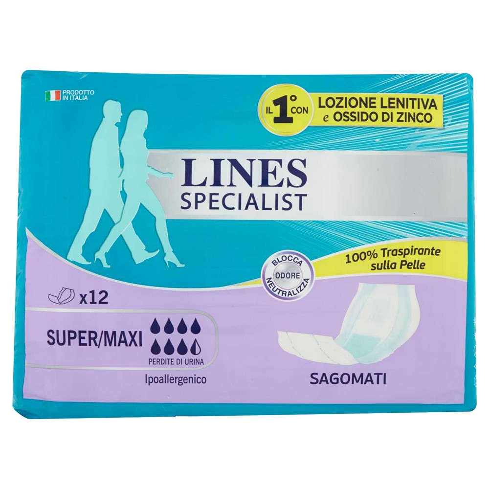Peceta higjenike, Lines specialist, me veshe, 12 cope. Produkti, i mbuluar tërësisht me pëlhurë "si pambuku" që merr frymë, ndihmon në reduktimin e djersitjes së lëkurës dhe mbajtjen e saj të freskët dhe të thatë. Me locion qetësues dhe oksid zinku, filtri përmban oksid zinku dhe locioni, në kontakt me lëkurën, krijon një barrierë mbrojtëse duke ndihmuar për të mbajtur lëkurën të shëndetshme dhe të thatë. Treguesi i ndryshimit i testuar dermatologjikisht pa latex, për të reduktuar rrezikun e alergjive.