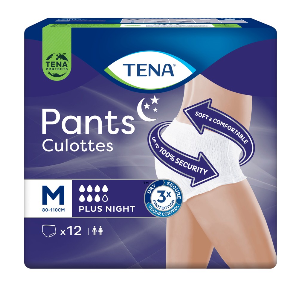 Një hap më i lartë në absorbueshmëri nga Tena Pants Plus Night Medium, këto pantallona unisex janë krijuar për të siguruar absorbueshmëri të lartë me një përshtatje të ngushtë. Ato karakterizohen nga kontrolli i aromave dhe një zonë unike e dyfishtë e absorbimit për thithjen e shpejtë, duke e mbajtur sipërfaqen të thatë dhe përdoruesin të rehatshëm. Barrierat e integruara të rrjedhjeve ofrojnë siguri dhe qetësi shtesë, ndërsa pëlhura e butë, elastike dhe e frymëmarrjes do të thotë se ndihet dhe lëviz njësoj si të brendshmet e zakonshme.