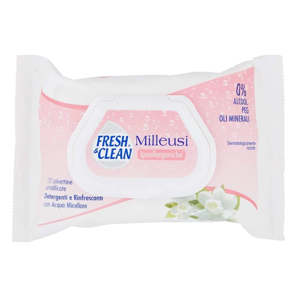 Peceta të lagura hipoalergjike Fresh&Clean shumëpërdorimshe falë ujit micelar dhe përbërjes pa alkool, PEG dhe vajra mineral. Janë të përshtatshme për pastrimin e lëkurave të ndjeshme dhe delikate. Paketimi përmban 20 peceta. I testuar dermatologjikisht.