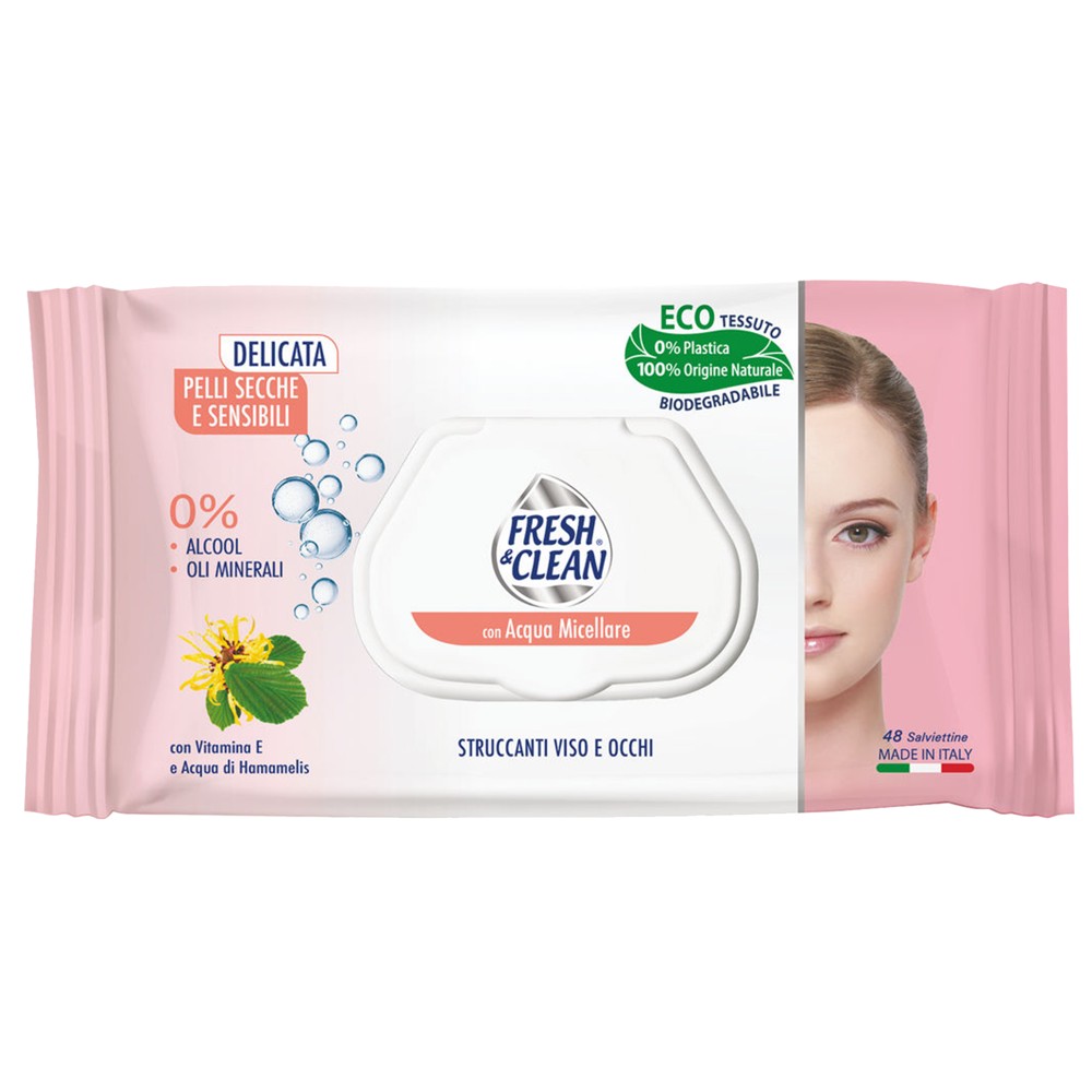 Peceta të lagura hipoalergjike Fresh&Clean shumëpërdorimshe falë ujit micelar dhe përbërjes pa alkool, PEG dhe vajra mineral. Janë të përshtatshme për pastrimin e lëkurave të ndjeshme dhe delikate. Paketimi përmban 48 peceta. I testuar dermatologjikisht.