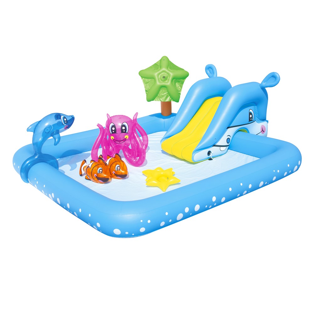 Pishinë e vogël me rrëshqitëse, për fëmijë, në formë katrore, prej materiali kloruri polivinili (PVC), me trashësi prej 0.27 mm, të përforcuar dhe të testuar paraprakisht, që e bën të qëndrueshme ndaj rrezeve të diellit, temperaturave të ftohta dhe gurëve apo objekteve të tjera të mprehta. Baza dhe muret anësore mund të fryhen me ajër, gjë që parandalon lëndimin e fëmijëve gjatë lojës. Pishina përdoret si një mënyrë për argëtimin e fëmijëve, është praktike në përdorim, nuk zë shumë hapësirë dhe është e përshtatshme për t'u vendosur në ambiente të jashtme. Pastrohet lehtësisht nëpërmjet një valvule kullimi të vendosur në bazën e pishinës. Pishina ka përmasa 238x206x86 cm dhe kapacitet mbajtës të ujit prej 308 litrash. Mund të montohet dhe çmontohet lehtësisht për vetëm 30 minuta, duke përdorur një pompë ajri. Seti gjithashtu përmban: