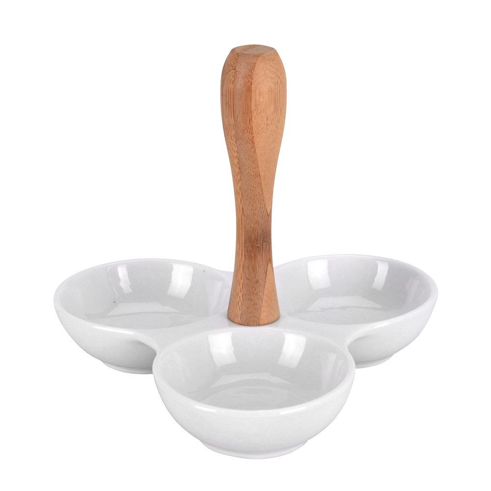 Një tas i trefishtë prej porcelani, i cili, falë versionit të tij klasik dhe ngjyrës së bardhë, do të bëhet një aksesor i këndshëm gjatë një vakti. Falë 3 tasave, do të keni mundësi të shërbeni disa ushqime në të njëjtën kohë. I përshtatshëm për të shërbyer ushqime, kikirikë ose salca të ndryshme. Është e pajisur me një dorezë praktike bambuje për bartje më të lehtë.