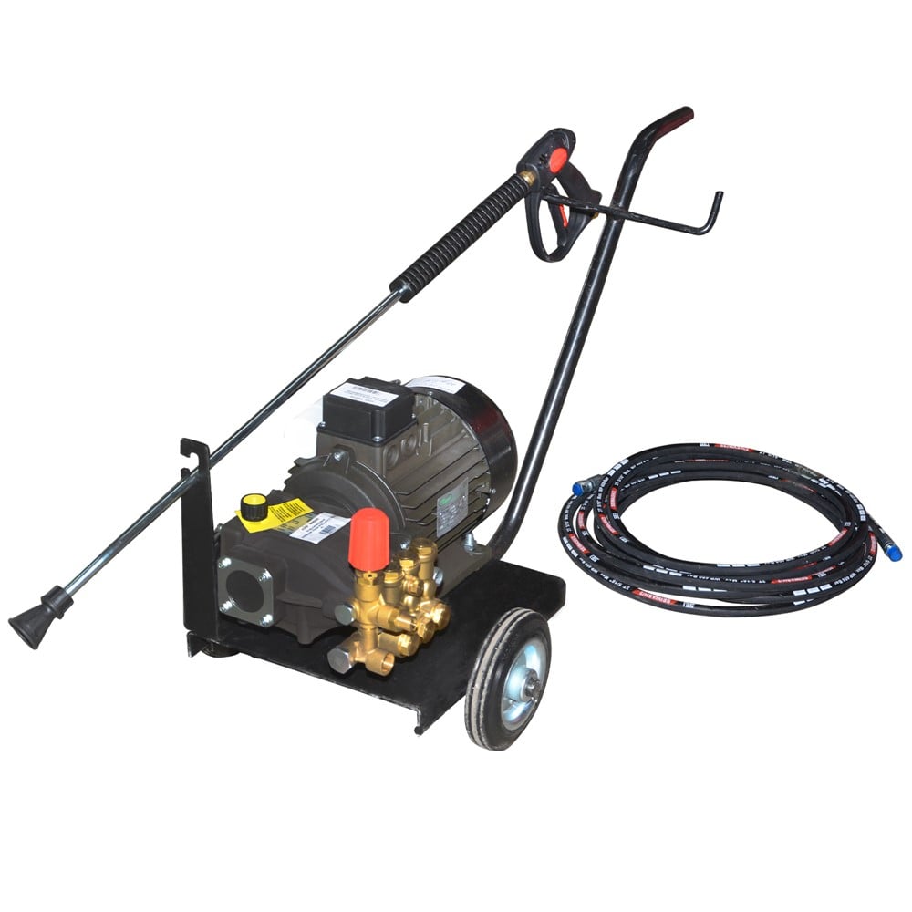 Pompë lavazhi profesionale, 2.2 KW, 150 bar 1400 RPM, performancë të lartë dhe jetëgjatësi. E pajisur me motorr të fuqishëm elektrik monofazë mund të largojë papastertitë në sekonda.