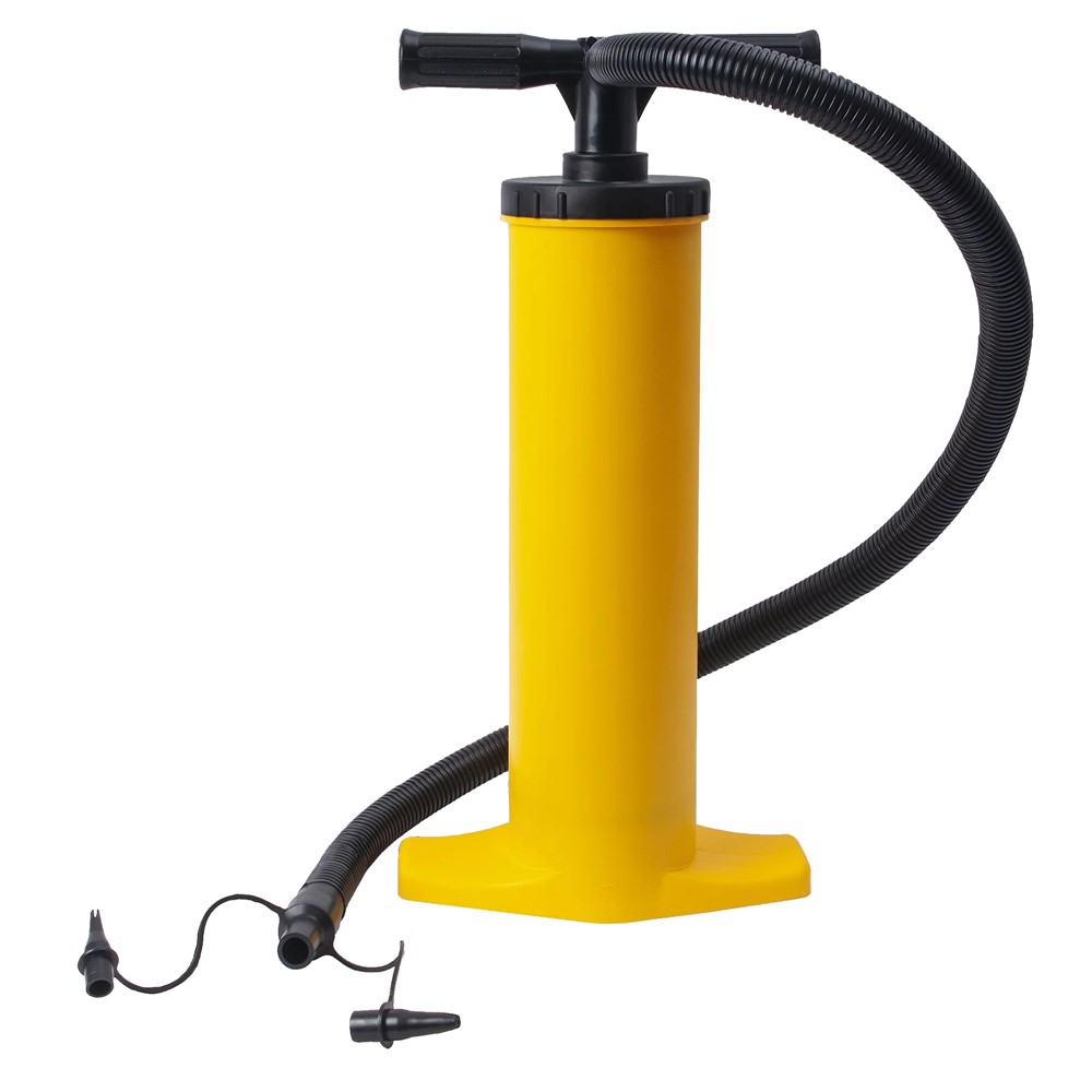 Pompe për kamping prej materiali plastik, Pompë ajri me veprim të dyfishtë. Pompon ajrin në të dy drejtimet. Ideale për fryrjen e artikujve të tillë si: pishina, pishina me vozitje, dyshekë me ajër, topa plazhi dhe më shumë. Pompë me bazë, dorezë, tub dhe përshtatës.