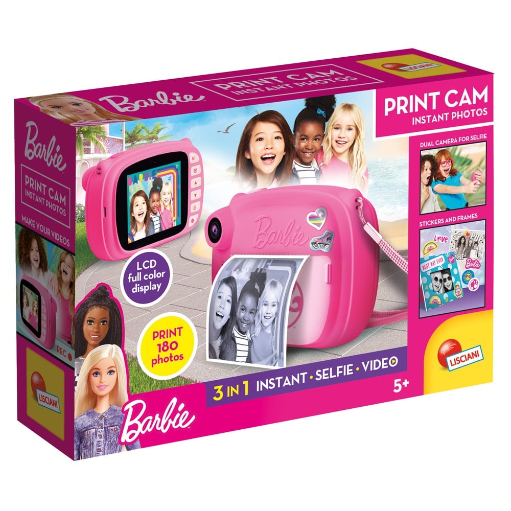 Një aparat fotografik i menjëhershëm për të krijuar dhe printuar foto me efekte argëtuese. Shumë e lehtë për t'u përdorur. Ju mund të bëni video dhe të mbledhni dhe të ndani foto me miqtë tuaj. Mund të bëni selfie falë kamerës së dyfishtë. Me kornizat fantastike të Barbie, ju mund të bëni një koleksion të të gjitha fotove tuaja! Me 10 korniza me efekte argëtuese. Krijoni efekte argëtuese dhe printoni menjëherë ato. Personalizojeni me ngjitëse. Krijoni një koleksion të fotove tuaja. Kamera: 3 rrotulla për 180 foto, lidhëse për të varur kamerën tuaj, 10 korniza kartoni, fletë ngjitëse, kaikues, udhëzues.