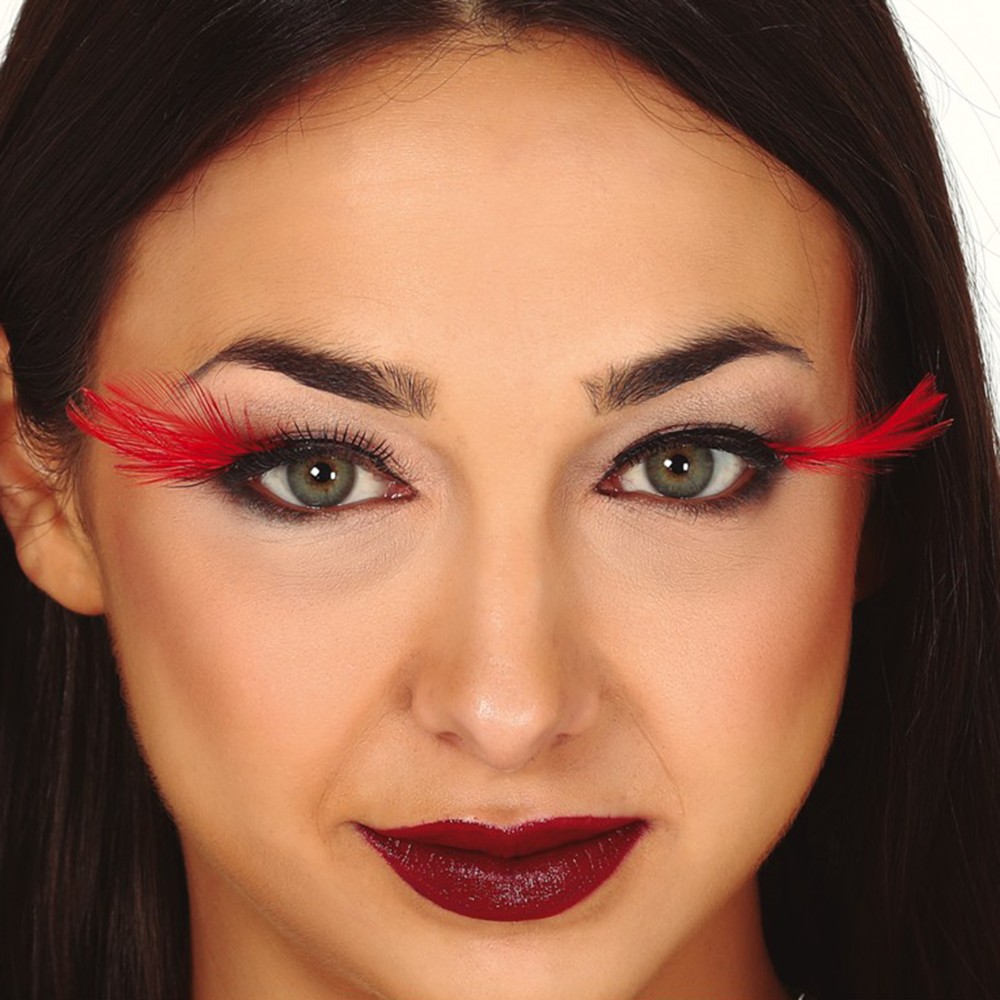Qerpikë falsë për Halloween, në ngjyrë të kuqe, me pupla. Përdoret si aksesor për veshje të ndryshme Halloween-i apo karnavalesh. Seti përmban dhe një ngjitës për aplikimin e qerpikëve.