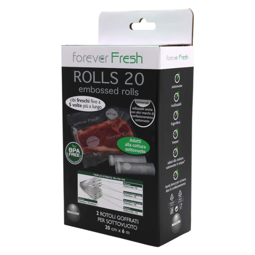 Këto qese ruajtëse e mbajnë ushqimin të freskët deri në 5 herë më gjatë, duke garantuar freski dhe duke kursyer para. Qeset e ruajtjes mund të përdoren në frigorifer ose në ngrirje të gatuara në një tenxhere të dyfishtë ose në mikrovalë për të shkrirë ushqimin e konservuar. Disponohen në madhësi të ndryshme për të plotësuar çdo nevojë dhe mund të përdoren me makineri të markave të tjera të izolimit me vakum. Prodhuar në Itali.
