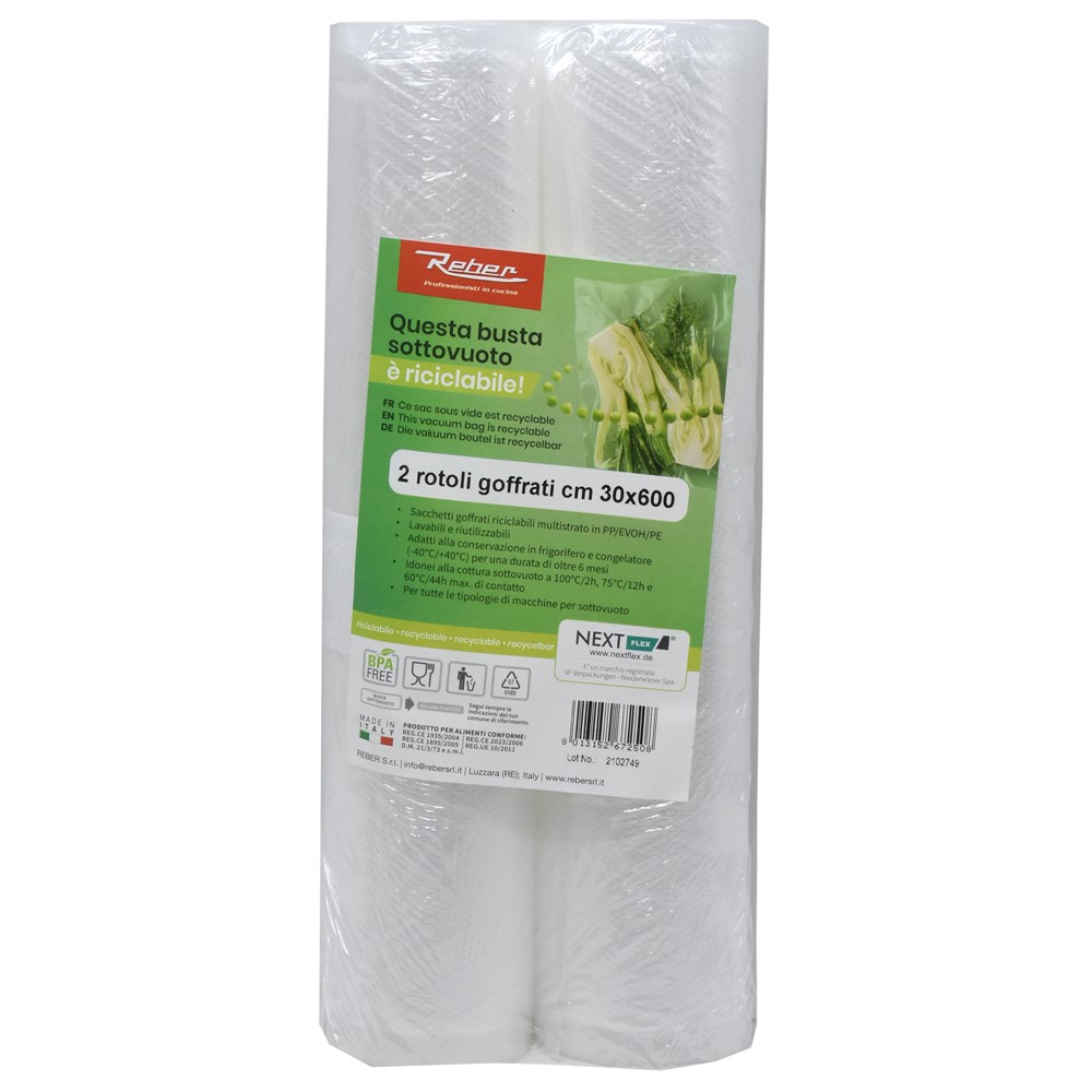 Qese paketimi me vakum me 5 shtresa të stampuara (najloni dhe polietileni), trashësi 105 mikron që e bën qesen të butë dhe më pak të brishtë. Shtresat e diferencuara të polietilenit e bëjnë atë më rezistent ndaj depërtimit të lagështirës, shtresa e najlonit mbron nga depërtimi i ajrit. Çertifikuar për zierje deri në 100°C. Certifikatat: 1935/2004 CE - 1895/2205 CE - 10/2011 CE - DM21 / 03/1973 - DPR 777/82