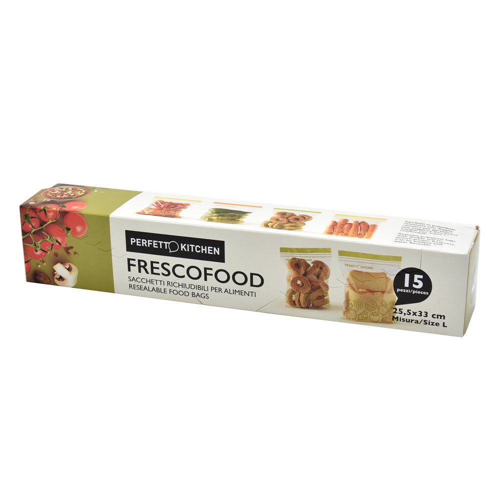 Qese për ruajtje ushqimesh, në madhësinë L, prej materiali plastik, me përmasa 25.5x33 cm, në ngjyrë transparente. Qesja është e pajisur me mbyllje hermetike dhe materiali përbërës ka veti higjienike dhe antibakteriale. Përdoret për ruajtjen në frigorifer të ushqimeve të ndryshme, duke ruajtur vetitë dhe shijen e ushqimit dhe duke parandaluar krijimin e aromave të pakëndshme. Ky produkt është i përshtatshëm për përdorim në ambiente shtëpie apo për ruajtjen e përbërësve të ndryshëm në kuzhina profesionale.
