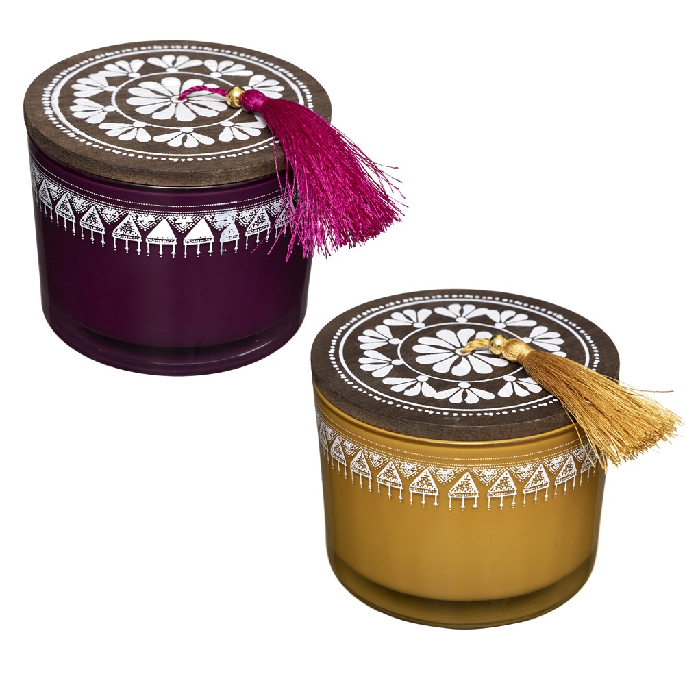 Qiri aromatik me mbajtese qelqi, arome dru, amber, myshk, ngjyre e kuqe/mustarde, D11 x H8.5 cm, 280 g