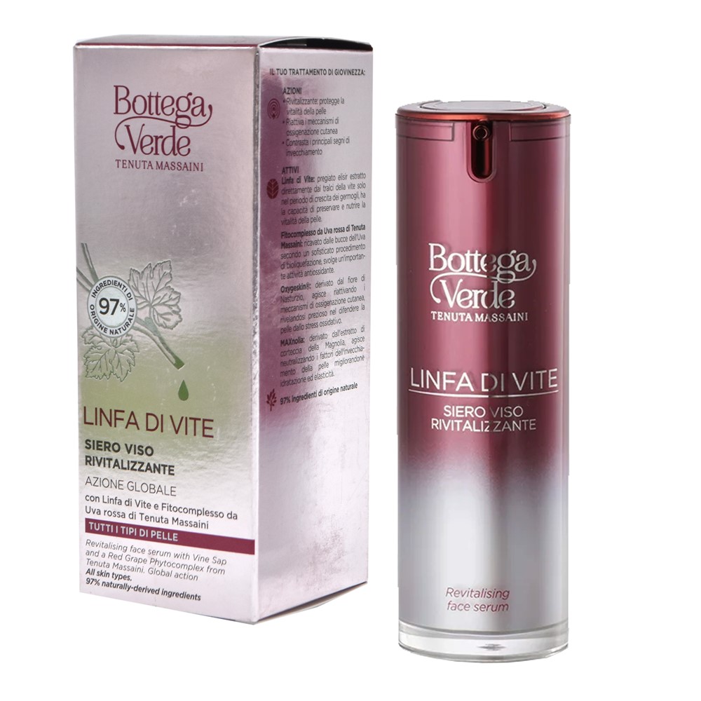 Serum rivitalizues për lëkurën e fytyrës, me një formulë me përbërës bimorë, të pasuruar me ekstrakt të frutave Massaini. Serumi redukton vijat e holla, rrudhat e lehta dhe njollat e errëta. Formula e pasur me përbërës aktivë pastron poret në thellësi, si edhe minimizon shenjat e poreve dhe plagëve, për një lëkurë të pastër dhe më të lëmuar. Mënyra e përdorimit: Aplikohet direkt në fytyrë të pastër, në mëngjes dhe në mbrëmje, para aplikimit të kremit hidratues.