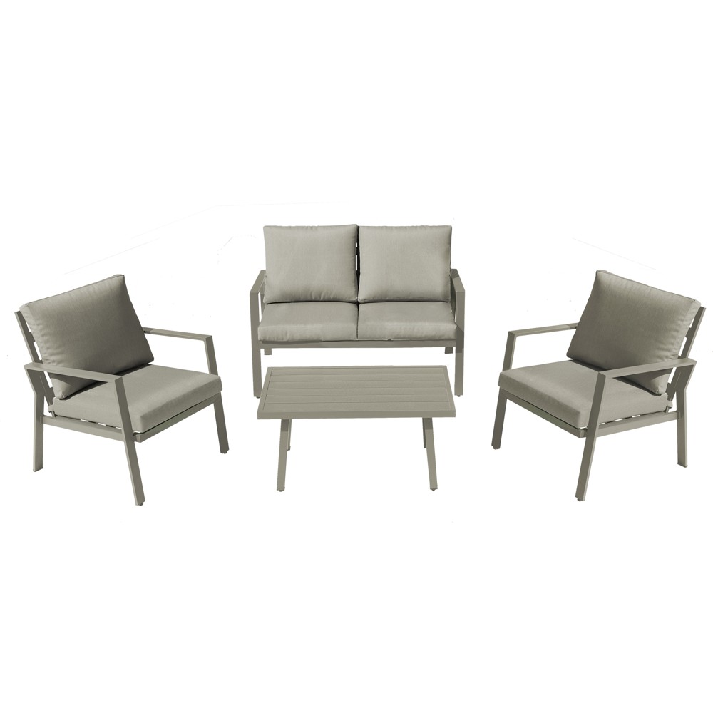 Set modern minimalist me ngjyrë bezhë. Vend i bollshëm për 4 persona si dhe shilte shumë komode dhe relaksuese. Falë tavolinës së mesit, ky set është i përshtatshëm për të shijuar çajin, kafen apo pijen tuaj të preferuar në ballkone, veranda apo kopshte të gjelbëruara. Materiali cilësor alumin, e bëjnë këtë set praktik, si dhe të përshtatshëm për përdorime afër bregdetit, pasi alumini ka veti antikorrozive.