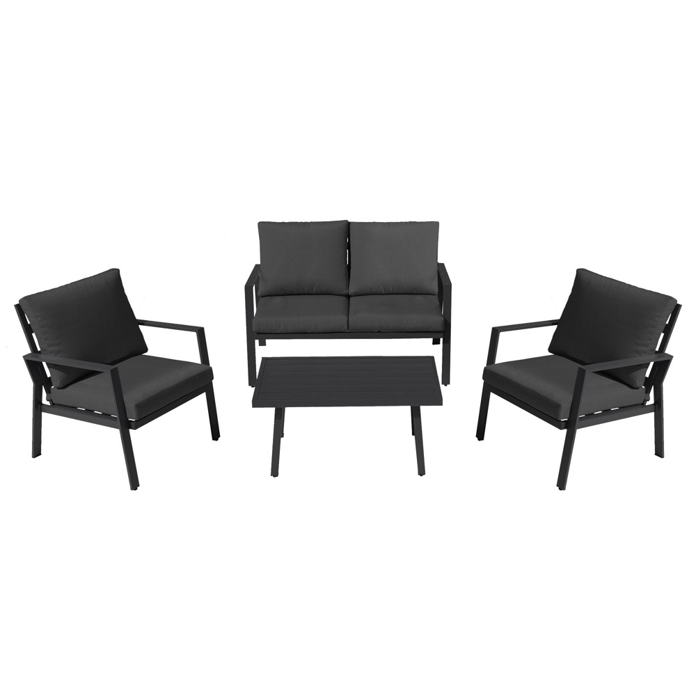 Set modern minimalist me ngjyrë gri antraziti. Vend i bollshëm për 4 persona si dhe shilte shumë komode dhe relaksuese. Falë tavolinës së mesit, ky set është i përshtatshëm për të shijuar çajin, kafen apo pijen tuaj të preferuar në ballkone, veranda apo kopshte të gjelbëruara. Materiali cilësor alumin, e bëjnë këtë set praktik, si dhe të përshtatshëm për përdorime afër bregdetit, pasi alumini ka veti antikorrozive.