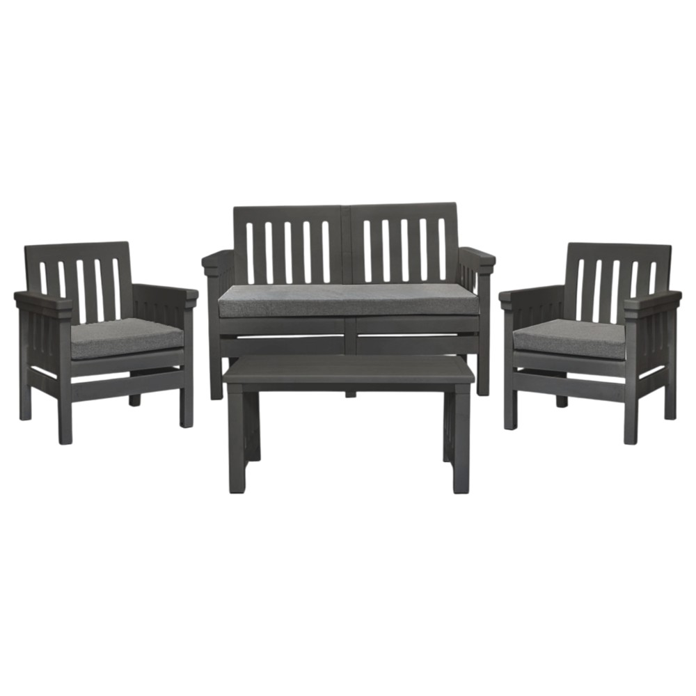 Set 2 kolltuk tek me shilte + 1 kolltuk dopjo me shilte + 1 tavolinë mesi, ratan plastik, strukture anthracit, shilte gri, teku 56x64xH89 cm / dopjo 56x118xH89 cm / tavolina 48x85xH42 cm