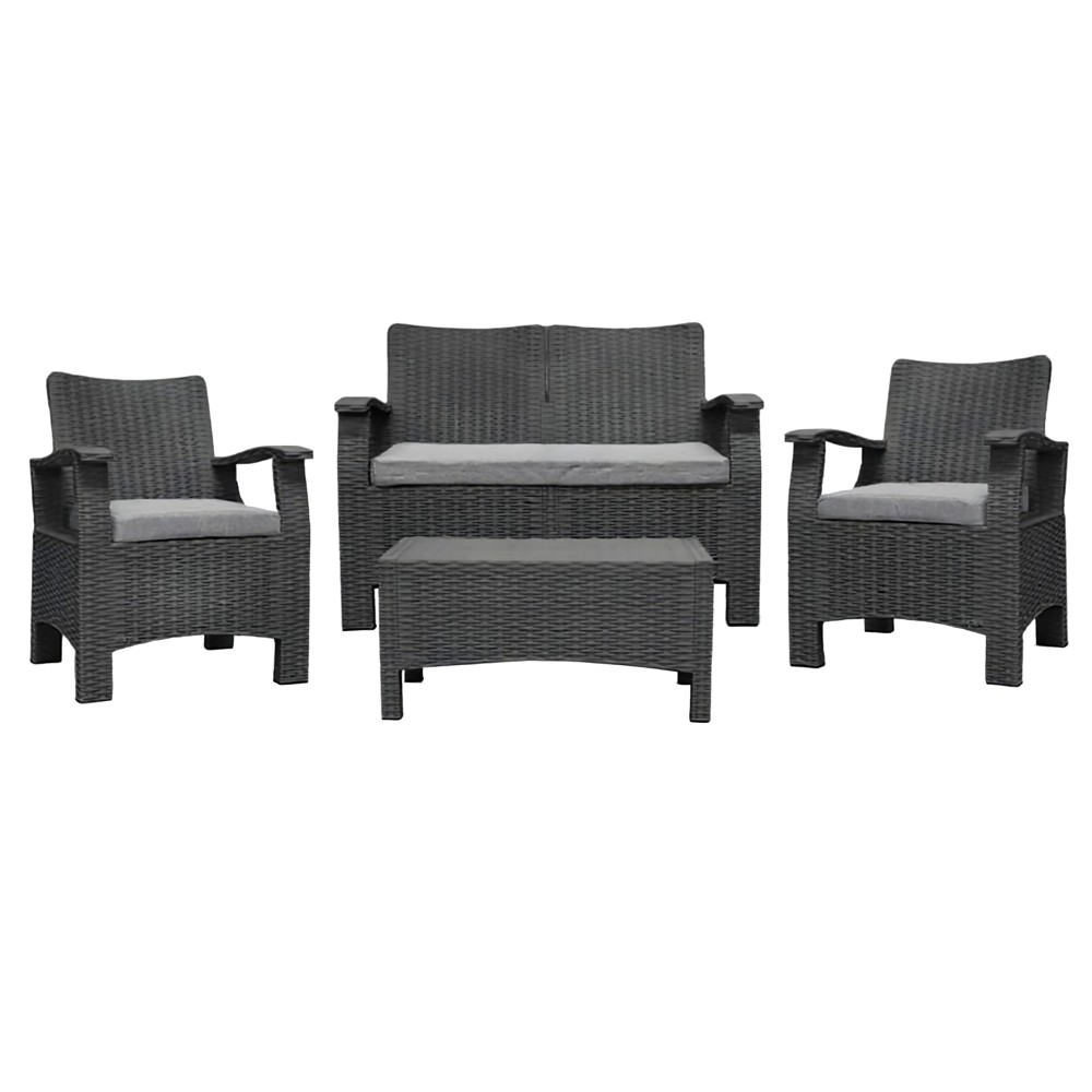 Set 2 kolltuk tek me shilte + 1 kolltuk dopjo me shilte + 1 tavolinë mesi, ratan plastik, strukture anthracit, shilte gri, teku 56x64xH89 cm / dopjo 56x118xH89 cm / tavolina 48x85xH42 cm