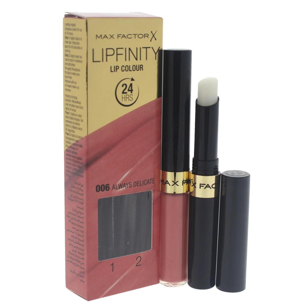 Set buzëkuq i lëngshëm dhe balsam hidratues, 006 Always Delicate, LipFinity, 2-step Long Lasting, Max Factor, plastikë, 2.3 ml + 1.9 g, rozë koral, 2 copë