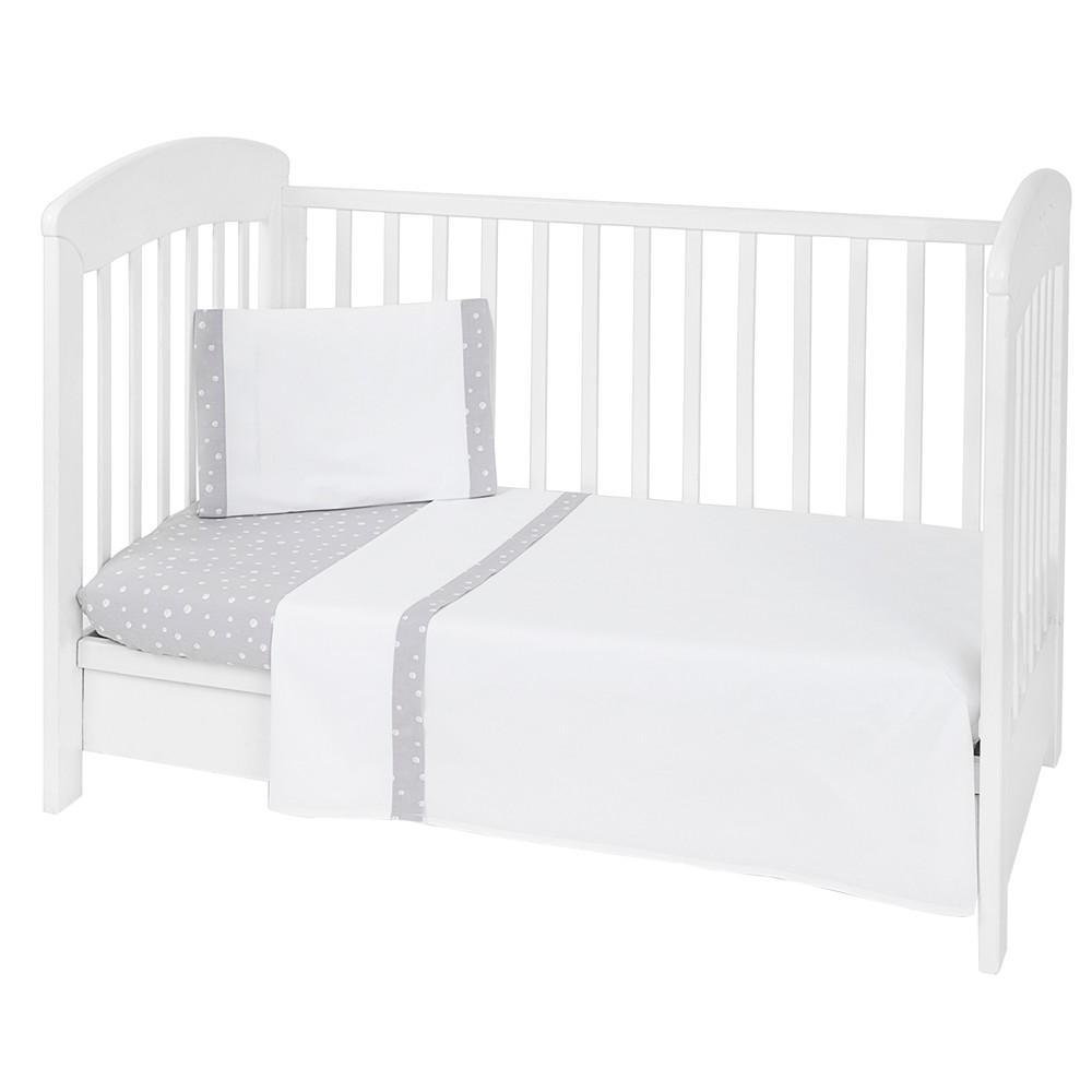 Set carcafësh për krevat bebesh, prej material 100% pambuk, në ngjyrë të bardhë dhe gri. Seti përmban një këllëf jastëku 35x55 cm, një carcaf të poshtëm 60x120 cm, si dhe një carcaf të sipërm 100x160 cm.