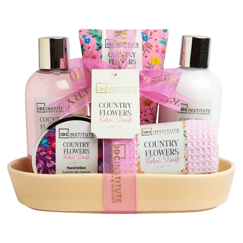 Set dushi, IDC Institute, Country Flowers, ceramic, 200 ml shower gel, 200 ml body lotion, 150 ml body scrub, 50 ml hand cream, towel, 1 pako
