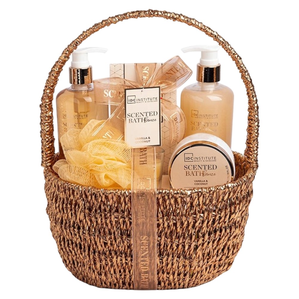 Set dushi, IDC, me shportë, 300 ml shower gel, 300 ml bubble bath, 100 ml body lotion, 100 gr kripë dushi, qiri, sfungjer, 1 pako