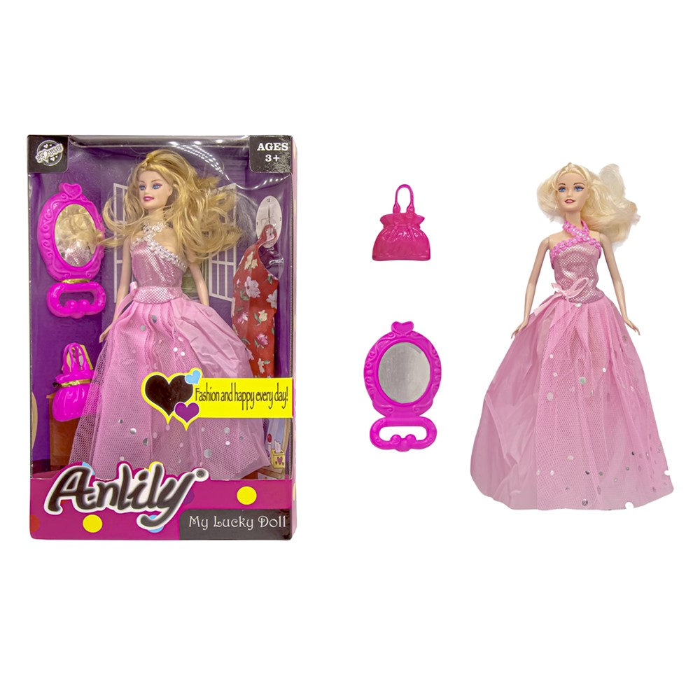 Set lodër për vajza, i cili përfshin një kukull, një fustan, një pasqyrë dhe një çantë, prej materiali plastik, në ngjyrë rozë. Ky set ndihmon në zhvillimin e imagjinatës, zhvillimin e shqisave dhe zhvillimin e aftësive të të mësuarit tek fëmijët, përmes lojës në role. Materiali përbërës dhe boja nuk kanë përmbajtje toksike apo të dëmshme për fëmijët dhe produkti është i çertifikuar për siguri në përdorim. Ky produkt është i përshtatshëm për përdorim nga fëmijë të moshës mbi 3 vjeç.