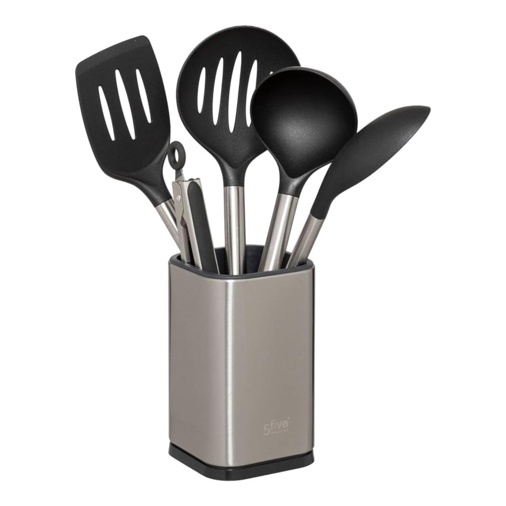 Ky set elegant lugë/pirunj gatimi, i përbërë nga inoks i qëndrueshëm dhe një mbajtëse xhami e rafinuar, është një shtesë e domosdoshme për çdo kuzhinë. Dizajni i tij modern dhe ngjyra argjend e shkëlqyeshme do të shtojnë një prekje elegance në ambientin tuaj të gatimit. Lugë dhe pirunj të dizajnuar për gatime të ndryshme, duke përfshirë lugë shërbyese, pirunj për mish, lugë për salca dhe të tjera. Mbajtësja e xhamit mban lugët dhe pirunjtë të organizuar dhe të arritshëm, duke e bërë gatimin më të lehtë. Ideale për gatim të ndryshëm, duke përfshirë përgatitjen e salcave, shërrimin e ushqimeve, gatimin e mishit dhe të tjera. E lehtë për t'u pastruar dhe për t'u ruajtur. Ky set lugë/pirunj gatimi me mbajtëse është një zgjedhje e shkëlqyer për të shtuar një prekje elegance dhe funksionaliteti në kuzhinën tuaj.