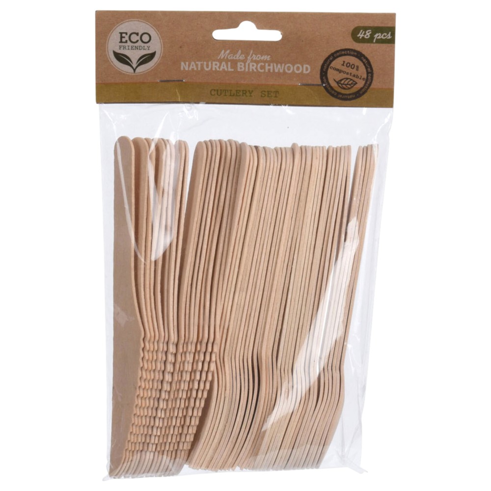 Seti prej 48 copësh lugë dhe pirunjsh prej druri në ngjyrë natyrale, me dimensione 22x14x3 cm, është një zgjidhje praktike dhe ekologjike për shërbimin e ushqimeve në festa, pikniqe apo përdorim të përditshëm. Materiali prej druri siguron qëndrueshmëri dhe një pamje natyrale e elegante, ndërsa dizajni i lehtë dhe ergonomik ofron rehati gjatë përdorimit.