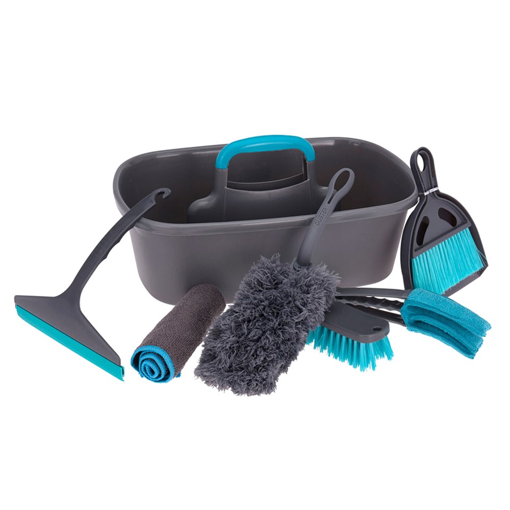 Set me 7 aksesorë pastrimi, i cili përmban një kosh për vendosjen e produkteve të pastrimit, një fshesë për pluhurat, një fshesë të vogël me lopatë, një shtytëse uji për pastrimin e xhamave, një pecetë mikrofibër dhe një furçë për pastrimin e njollave të forta. Produktet kanë formë ergonomike, peshë të vogël dhe mund të manovrohen lehtësisht. Ky set është i përshtatshëm për pastrimin e sipërfaqeve të sheshta, si dyshemetë me pllaka, parket, mermer, laminat, linoleum, sipërfaqet e drurit apo sipërfaqet e shtruara me gur natyral.