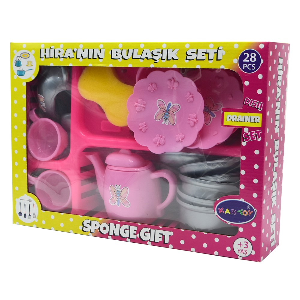 Set lodër për fëmijë, i cili përmban enë kuzhine të ndryshme, një sfungjer për larjen e enëve, një mbajtëse për kullimin e enëve dhe aksesorë të tjerë. Ky set ndihmon në zhvillimin e imagjinatës tek fëmijët, stimulon zhvillimin e aftësive motorike dhe ndihmon në zhvillimin e aftësive të të mësuarit dhe aftësive perceptuese, përmes lojës në role. Materiali përbërës dhe boja nuk kanë përmbajtje toksike apo të dëmshme për fëmijët dhe produkti është i çertifikuar për siguri në përdorim. Ky produkt është i përshtatshëm për përdorim nga fëmijë të moshës mbi 3 vjeç.