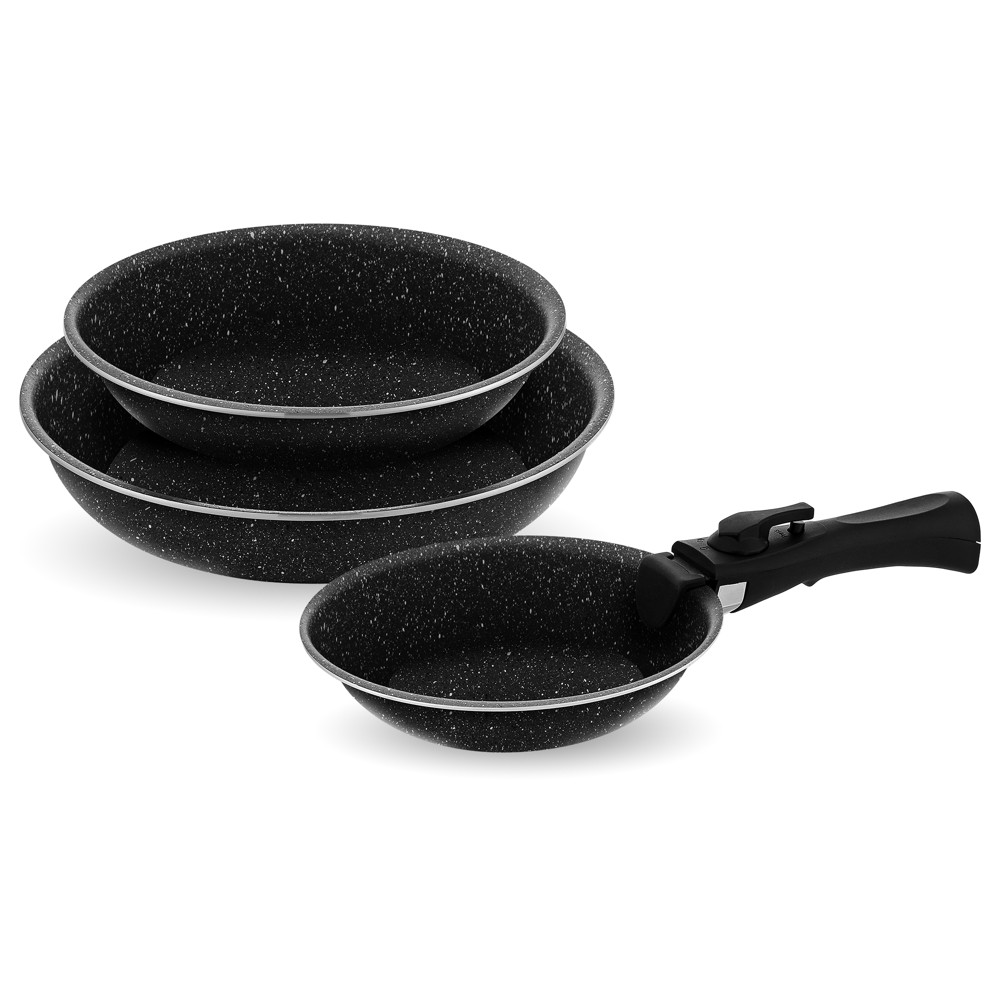 Transformoni mënyrën si gatuani dhe organizoni kuzhinën tuaj me këtë set tiganësh revolucionar në ngjyrë gri. Projektuar për kuzhinierin modern, ky set elegant dhe tepër funksional, i përbërë nga tiganë me diametër 18 cm, 22 cm dhe 26 cm, sjell një nivel të ri komoditeti dhe efikasiteti në shtëpinë tuaj. Çelësi i shkathtësisë së këtij seti është doreza inovative e lëvizshme. Kjo veçori unike ju lejon të përdorni të njëjtin tigan direkt nga soba në furrë, apo edhe ta shërbeni direkt në tavolinë. Kur nuk është në përdorim, thjesht hiqni dorezën për të kursyer hapësirë të çmuar në dollapët tuaj, duke e bërë ruajtjen pa sforcim dhe kuzhinën tuaj më të organizuar. Të ndërtuar nga alumini i cilësisë së lartë dhe të veshur me një shtresë të avancuar qeramike kundër ngjitjes, këta tiganë garantojnë një gatim pa mundim. Ushqimi rrëshqet lehtësisht, duke eliminuar nevojën për vaj të tepërt dhe duke e bërë pastrimin një punë të shpejtë. Shtresa qeramike është gjithashtu e sigurt dhe pa kimikate të dëmshme, duke mbështetur një stil jetese më të shëndetshëm. Baza e tiganëve është e përshtatshme për induksion, duke siguruar shpërndarje uniforme dhe jashtëzakonisht të shpejtë të nxehtësisë në të gjithë sipërfaqen. Kjo jo vetëm që garanton gatim të barabartë dhe të përsosur çdo herë, por gjithashtu maksimizon efikasitetin energjetik, pavarësisht nëse keni një pllakë me gaz, elektrike, qeramike apo induksion. Ky set tiganësh është më shumë sesa thjesht mjete gatimi; është një investim në funksionalitet, stil dhe gatim të shëndetshëm. Zgjidhni këtë set për të thjeshtuar gatimin tuaj dhe për të krijuar një kuzhinë më të organizuar dhe efikase!